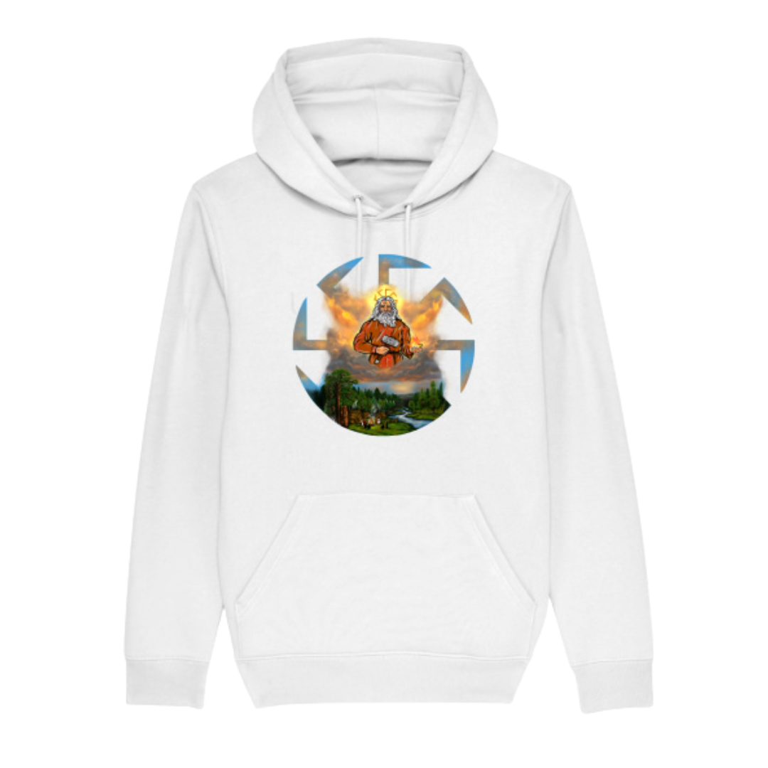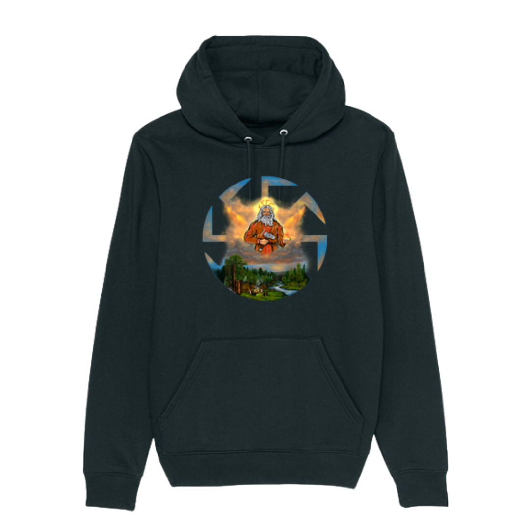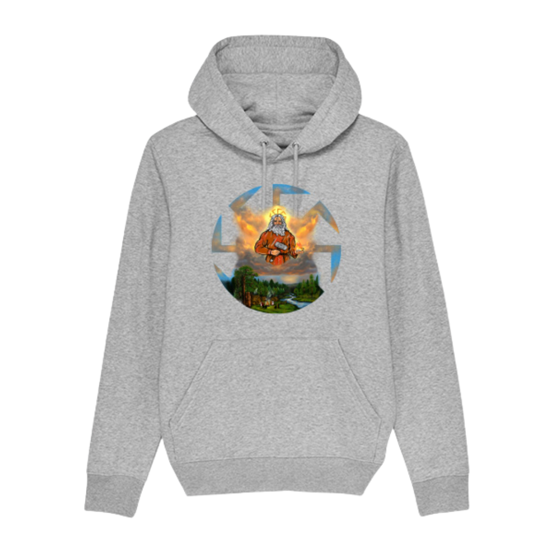 Bluza słowiańska z kapturem Swaróg to wygodna i stylowa propozycja dla miłośników słowiańskiej symboliki. Grafika przedstawia Swaroga – boga ognia, nieba i kowalstwa – ukazanego w autorskiej, wyrazistej interpretacji inspirowanej mitologią słowiańską. Wykonana z wysokiej jakości bawełny organicznej, jest miękka, oddychająca i komfortowa na co dzień.
