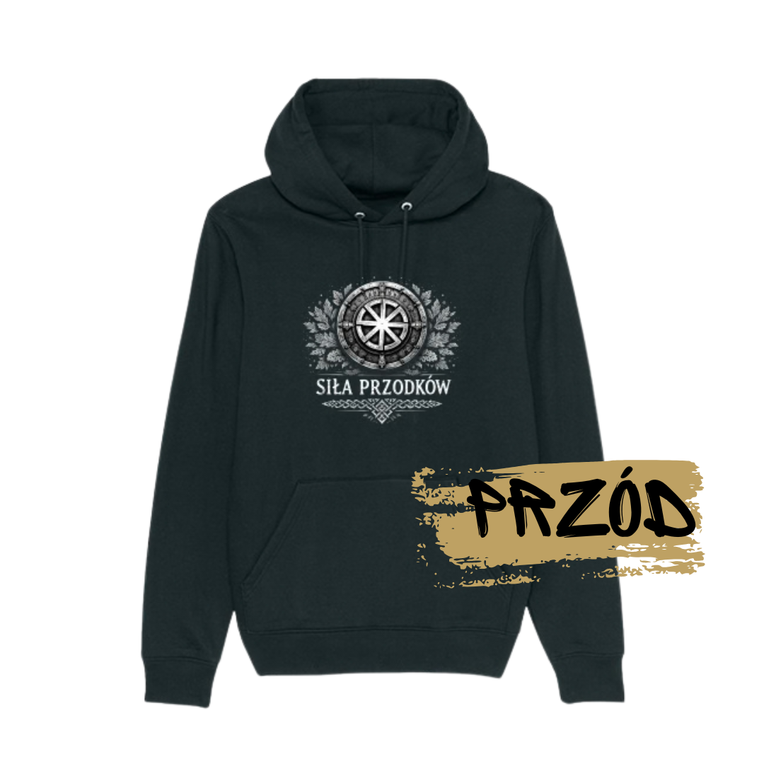 Uniwersalna bluza z kapturem z linii Eco Aware. Z przodu nadruk: Siła Przodków a z tyłu: Kołowrót.