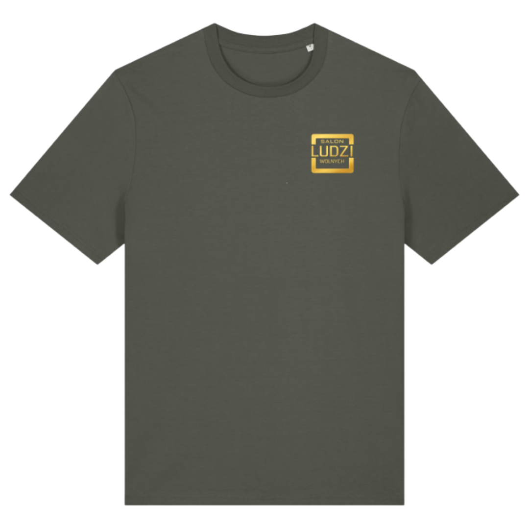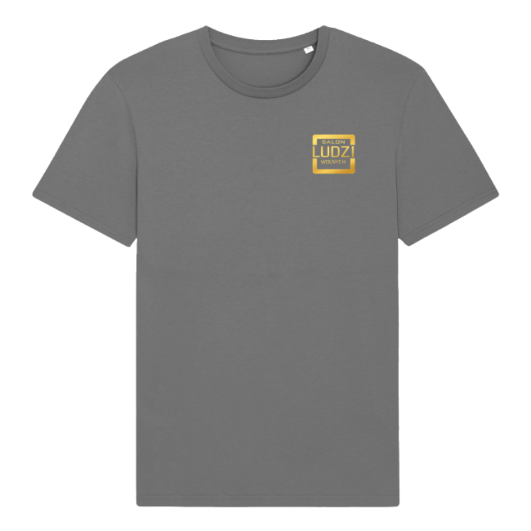 Koszulka z bawełny organicznej z linii Eco Friendly. Z przodu złoty nadruk: logo Salonu Ludzi Wolnych.